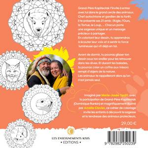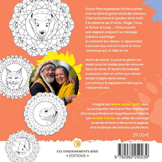 Ce cahier de coloriage, imagine par Marie-Josee Tardif avec la participation de Grand-Pere Kapiteotak (Dominique Rankin) et illustre par Amelie Clavier, invite les enfants a rencontrer 21 animaux protecteurs inspires de la sagesse autochtone. Chaque page devient une aventure en couleurs : l'Aigle, l'Ours, la Tortue, le Loup, chacun partage sa presence, sa force et son message. En coloriant, l'enfant apprend a ecouter la voix de la foret et a sentir la force lumineuse qui vit deja en lui. Avant de dormir, il peut glisser son dessin sous son oreiller pour retrouver ses amis animaux dans ses reves. Un livre ludique et apaisant, qui relie les enfants a la nature, a leurs emotions et a la beaute du monde vivant.