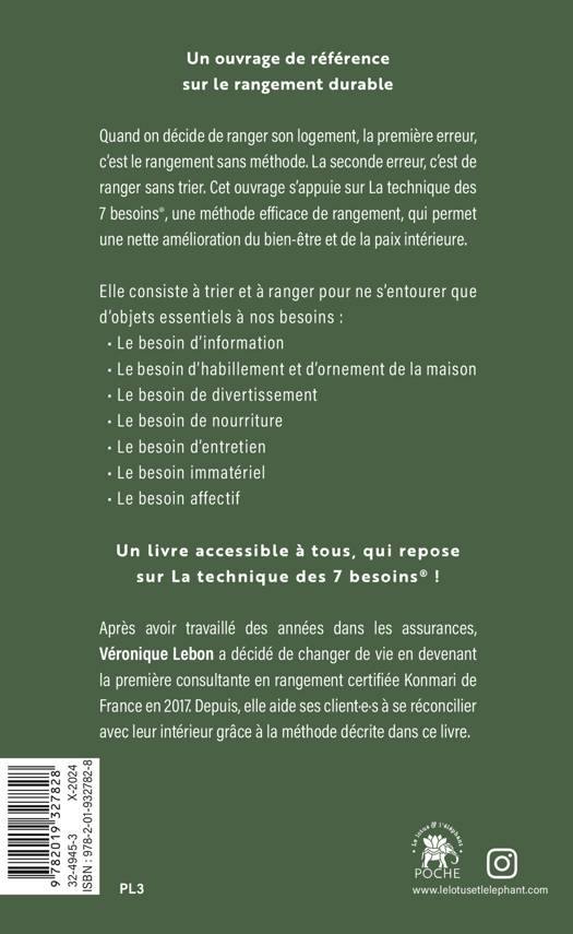 Un livre accessible à tous, qui repose sur La technique des 7 besoins® !Après avoir travaillé des années dans les assurances, Véronique Lebon a décidé de changer de vie en devenant la première consultante en rangement certifiée Konmari de France en 2017. Depuis, elle aide ses client.e.s à se reconcilier avec leur intérieur grâce à la méthode décrite dans ce livre.
