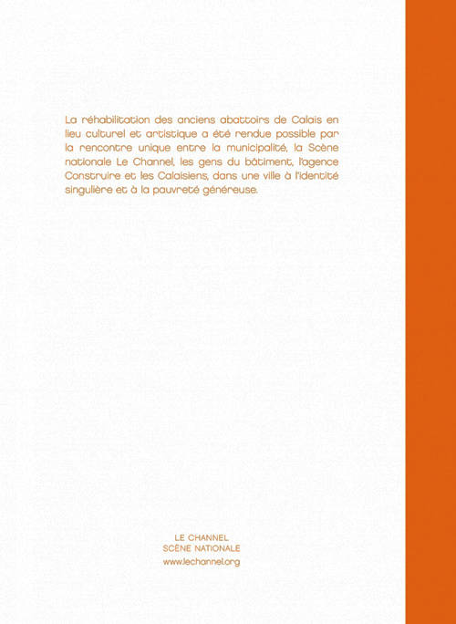 La réhabilitation des anciens abattoirs de Calais en lieu culturel et artistique a été rendue possible par la rencontre unique entre la municipalité, la Scène nationale Le Channel, les gens du bâtiment, l'agence Construire et les Calaisiens, dans une ville à l'identité singulière et à la pauvreté généreuse.