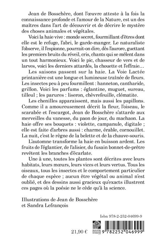 Jean de Bosschere, dont l'oeuvre atteste a la fois la connaissance profonde et l'amour de la Nature, est un des maitres dans l'art de decouvrir et de decrire le mystere des choses animales et vegetales. Voici la haie vive: monde secret, fourmillant d'etres dont elle est le refuge, l'abri, le garde-manger. Le naturaliste l'observe, il l'espionne, pourrait-on dire, des l'aurore, guettant les premiers bruits du reveil, cris, chants qui se melent dans un tout harmonieux. Voici le pic, chasseur de vers et de larves, voici les derniers attardes, la chouette et l'effraie... Les saisons passent sur la haie. La Voie Lactee printaniere est une longue et lumineuse trainee de fleurs. Les insectes peu a peu fourmillent: hanneton, cantharide, grillon. Voici les parfums: eglantine, muguet, sureau, tilleul; les parures: liseron, chevrefeuille, clematite. Les chenilles apparaissent, mais aussi les papillons. Comme il a amoureusement decrit la fleur, l'oiseau, le scarabee et l'escargot, Jean de Bosschere s'attarde aux merveilles du vanesse, du paon de jour, du machaon. La haie offre ses bouquets: violette, campanule, digitale; elle est faite d'arbres aussi: charme, erable, cornouillet. La nuit, c'est le regne de la belette et de la chauve-souris. L'automne transforme la haie en buisson ardent. Les fruits de l'eglantier, de l'alisier, du fusain bonnet-de-pretre revetent les branches d'ecarlate. Une a une, toutes les plantes sont decrites avec leurs habitats, leurs moeurs, leurs vices et leurs vertus. Tous les oiseaux, tous les insectes et le comportement particulier de chaque espece; aucun etre vegetal ou animal n'est oublie, et des dessins aussi gracieux qu'exacts illustrent ces pages ou la poesie ne le cede qu'a la science.