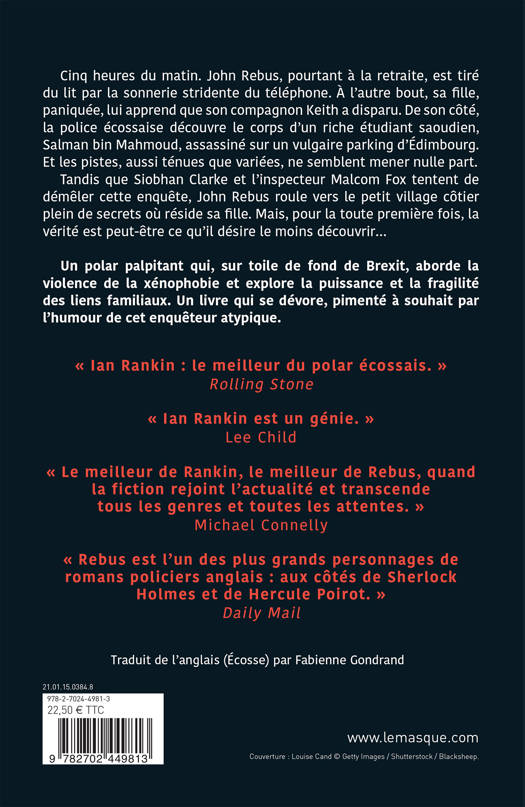Cinq heures du matin. John Rebus, pourtant à la retraite, est tiré du lit par la sonnerie stridente du téléphone. À l’autre bout, sa fille, paniquée, lui apprend que son compagnon Keith a disparu. De son côté, la police écossaise découvre le corps d’un riche étudiant saoudien, Salman bin Mahmoud, assassiné sur un vulgaire parking d’Édimbourg. Et les pistes, aussi ténues que variées, ne semblent mener nulle part.