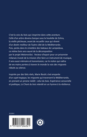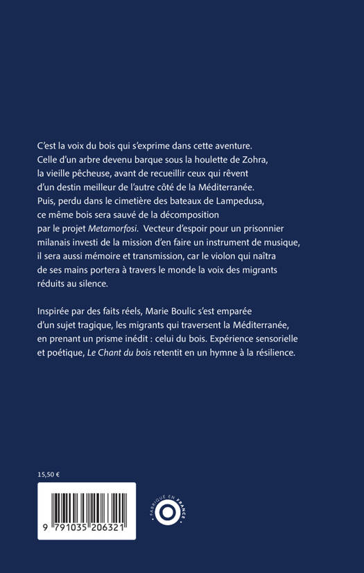 C'est la voix du bois qui s'exprime dans cette aventure. Celle d'un arbre devenu barque sous la houlette de Zohra, la vieille pêcheuse, avant de recueillir ceux qui rêvent d'un destin meilleur de l'autre côté de la Méditerranée. Puis, perdu dans le cimetière des bateaux de Lampedusa, ce même bois sera sauvé de la décomposition par le projet Metamorfosi. Vecteur d'espoir pour un prisonnier milanais investi de la mission d'en faire un instrument de musique, il sera aussi mémoire et transmission, car le violon qui naîtra de ses mains portera à travers le monde la voix des migrants réduits au silence. Inspirée par des faits réels, Marie Boulic s'est emparée d'un sujet tragique, les migrants qui traversent la Méditerranée, en prenant un prisme inédit : celui du bois. Expérience sensorielle et poétique, Le Chant du bois retentit en un hymne à la résilience.