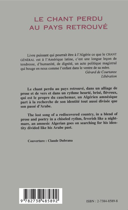 Le chant perdu au pays retrouvé, dans un alliage de prose et de vers et dans un rythme heurté, brisé, fiévreux, qui est le propre du cauchemar, un Algérien amnésique part à la recherche de son identité tout aussi divisée que son passé d'Arabe.