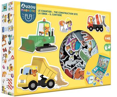 Un coffret qui invite l'enfant à recomposer, sur les tableaux aimantés, différentes activités sur le chantier et le site de construction. Grâce aux 46 aimants et aux deux décors, l'enfant développe sa motricité fine et apprend à reconnaître et nommer les outils et les engins de chantier. Il est aidé par de petites cartes.