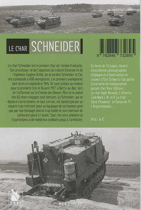 Le char Schneider, voulu par le colonel Estienne, est le premier char français opérationnel, engagé pour la première fois le 16 avril 1917 à Berry-au-Bac et Juvincourt. Même s’il n’est pas parfait, il est amélioré au cours des mois et continue sa carrière jusqu’à la fin de la guerre, étant engagé dans de nombreuses batailles que nous détaillons dans cet ouvrage.