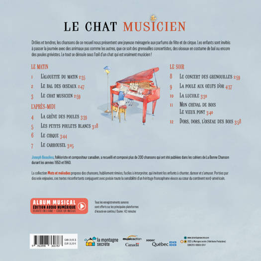 Le chat musicien est une sélection exceptionnelle de chansons écrites pour les enfants dans les années 40. Pour le folkloriste et compositeur Joseph Beaulieu, toutes les occasions sont bonnes pour s'amuser au détour d'une rime! Drôles et tendres, les pièces musicales n'ont pas pris une ride. Dans le livre, chaque illustration est une fête de couleurs dans laquelle évolue des grenouilles concertistes et des oiseaux en costumes de bal! Une joyeuse ménagerie qui fait danser et rêver les petits. Avec, entre autres, Jeanne Cherhal et Enzo Enzo comme interprètes.