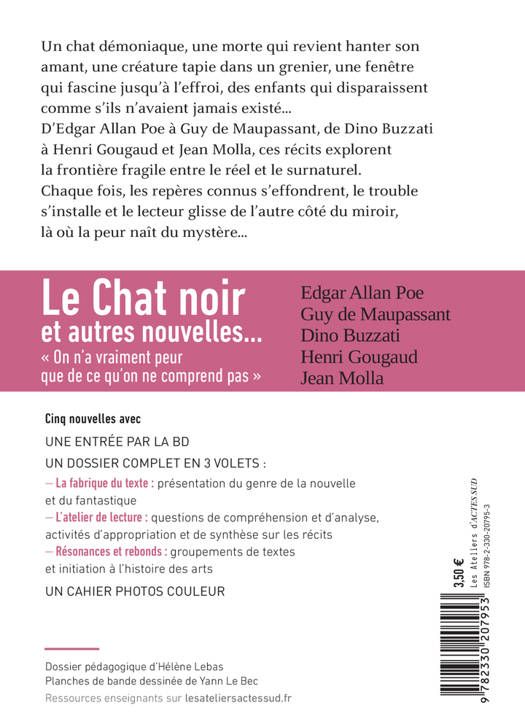 Un chat démoniaque, une morte qui revient hanter son amant, une créature tapie dans un grenier, une fenêtre qui fascine jusqu'à l'effroi, des enfants qui disparaissent comme s'ils n'avaient jamais existé... D'Edgar Allan Poe à Guy de Maupassant, de Dino Buzzati à Henri Gougaud et Jean Molla, ces récits explorent la frontière fragile entre le réel et le surnaturel. Chaque fois, les repères connus s'effondrent, le trouble s'installe et le lecteur glisse de l'autre côté du miroir, là où la peur naît du mystère. Cinq nouvelles avec UNE ENTRÉE PAR LA BD UN DOSSIER COMPLET EN 3 VOLETS : - La fabrique du texte : présentation du genre de la nouvelle et du fantastique - L'atelier de lecture : questions de compréhension et d'analyse, activités d'appropriation et de synthèse sur les récits - Résonances et rebonds : groupements de textes et initiation à l'histoire des arts UN CAHIER PHOTOS COULEUR