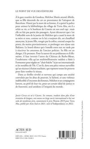 À la gare routière de Gandesa, Melchor Marín attend, fébrile, que sa fille descende du car en provenance de l'aéroport de Barcelone. Hanté par la mort de sa femme, il a quitté la police pour animer la bibliothèque du village de Terra Alta, où il a refait sa vie, et le bonheur de Cosette est son seul cap ; mais elle ne fait pas partie des passagers. Ayant découvert que c'est l'inflexible sens de la justice de Melchor qui a causé la mort de sa mère et non, comme on le lui a toujours dit, un chauffard anonyme, la jeune fille, rongée par la colère, entend couper les ponts, du moins provisoirement, et prolonger son séjour aux Baléares. Le lourd silence qui s'installe entre eux ne tarde pas à réactiver les antennes de l'ancien policier. Sa fille est en danger, il le pressent. Pour la sauver de ses prédateurs et d'elle-même, il faut investir l'antre du Château de Barbe-Bleue, l'exubérante villa qu'un multimillionnaire suédois a bâtie à Formentor pour régaler en "chair fraîche" la jet-set internationale et les notables de l'île. C'est là, dans une pièce mieux surveillée qu'un réacteur à fusion nucléaire, que reposent toutes les preuves pour faire tomber le réseau. Dans ce thriller révolté et nerveux qui campe une société convulsée par les abus de pouvoir, la lâcheté, et une violence indéfectible à l'encontre des femmes, Melchor et ses compagnons luttent, au péril de leur vie, pour un certain idéal de justice et de fraternité, seul antidote à l'iniquité du monde.