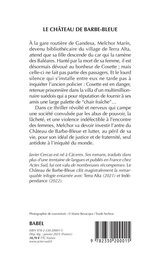 À la gare routière de Gandesa, Melchor Marín, devenu bibliothécaire du village de Terra Alta, attend que sa fille descende du car qui la ramène des Baléares. Hanté par la mort de sa femme, il est désormais dévoué au bonheur de Cosette ; mais celle-ci ne fait pas partie des passagers. Et le lourd silence qui s'installe entre eux ne tarde pas à inquiéter l'ancien policier : Cosette est en danger, retenue prisonnière dans la villa d'un multimillionnaire suédois qui a pour réputation de fournir à ses amis une large palette de "chair fraîche"... Dans ce thriller révolté et nerveux qui campe une société convulsée par les abus de pouvoir, la lâcheté, et une violence indéfectible à l'encontre des femmes, Melchor va devoir investir l'antre du Château de Barbe-Bleue et lutter, au péril de sa vie, pour son idéal de justice et de fraternité, seul antidote à l'iniquité du monde.