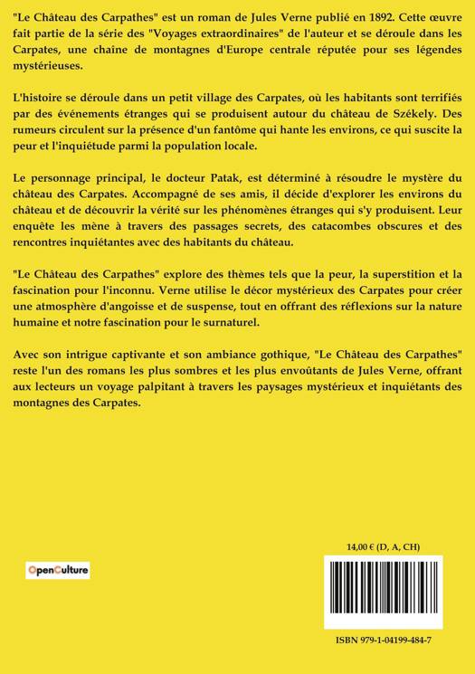 "Le Château des Carpathes" est un roman de Jules Verne publié en 1892. Cette oeuvre fait partie de la série des "Voyages extraordinaires" de l'auteur et se déroule dans les Carpates, une chaîne de montagnes d'Europe centrale réputée pour ses légendes mystérieuses.