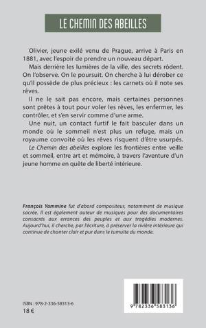 Olivier, jeune exilé venu de Prague, arrive à Paris en 1881, avec l'espoir de prendre un nouveau départ. Mais derrière les lumières de la ville, des secrets rôdent. On l'observe. On le poursuit. On cherche à lui dérober ce qu'il possède de plus précieux: les carnets où il note ses rêves. Il ne le sait pas encore, mais certaines personnes sont prêtes à tout pour voler les rêves, les enfermer, les contrôler, et s'en servir comme d'une arme. Une nuit, un contact furtif le fait basculer dans un monde où le sommeil n'est plus un refuge, mais un royaume convoité où les rêves risquent d'être usurpés. Le Chemin des abeilles explore les frontières entre veille et sommeil, entre art et mémoire, à travers l'aventure d'un jeune homme en quête de liberté intérieure.