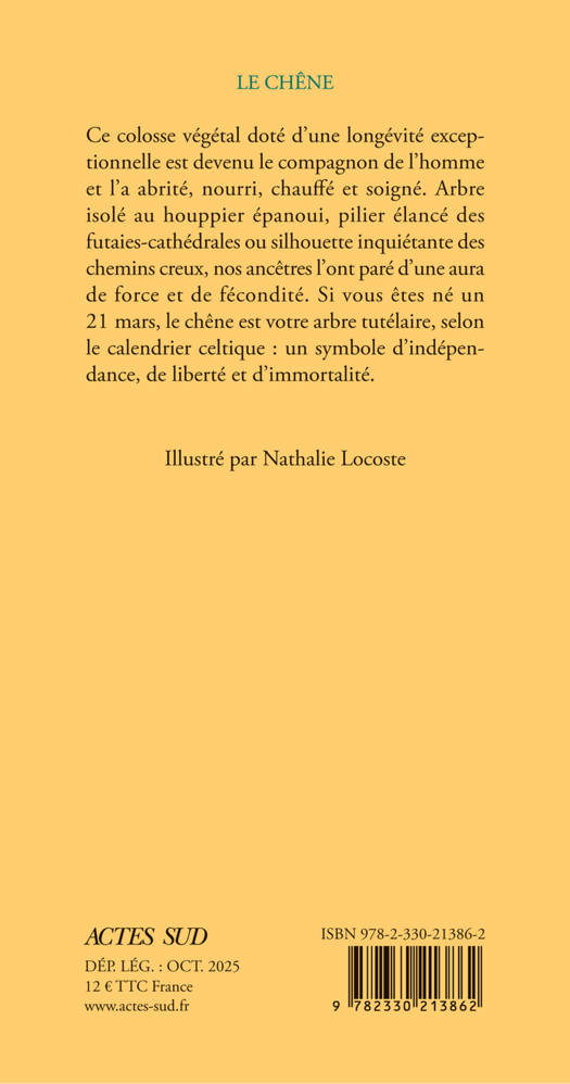 Une nouvelle édition avec rabats, sur papier de qualité, pour une collection emblématique « Le Nom de l'arbre » qui détaille l'anatomie et les besoins de chaque espèce et dévoile leur personnalité symbolique et leur place dans notre imaginaire. Ce colosse végétal doté d'une longévité exceptionnelle est devenu le compagnon de l'homme et l'a abrité, nourri, chauffé et soigné. Arbre isolé au houppier épanoui, pilier élancé des futaies-cathédrales ou silhouette inquiétante des chemins creux, nos ancêtres l'ont paré d'une aura de force et de fécondité. Si vous êtes né un 21 mars, le chêne est votre arbre tutélaire, selon le calendrier celtique : un symbole d'indépendance, de liberté et d'immortalité.