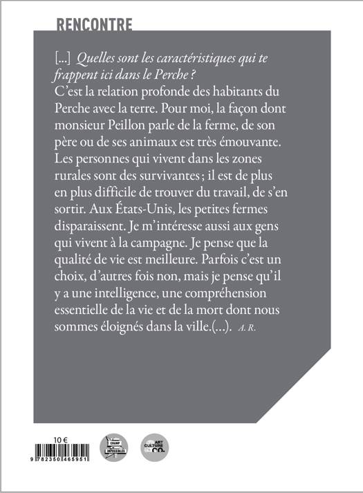 En 2021 et 2022, Anne Rearick est venue passer quelques mois dans le Perche auprès des habitants, de leurs animaux et de leurs paysages. Sa photographie dépeint l’expérience quotidienne des univers dans lesquelles elle s’immerge et qu’elle célèbre avec délicatesse. “Débarrassée de tout projet globalisant, elle laisse chacun s’exprimer tour à tour avec des regards, des poses, des gestes, un mouvement et elle renoue justement avec cette photographie profondément humaniste qui ne regarde jamais son nombril, qui ne cherche pas son ego ou son identité mais va à la rencontre de l’autre, son égal” (Christian Caujolle). Aux États-Unis, en Afrique du Sud, au Pays Basque, à Sète, comme dans le Perche, elle porte ce même regard généreux sur les êtres pour capter des images qui veulent, avant tout, dire le plaisir de l’instant et la qualité de la rencontre. En complément de ce riche travail photographique, Rémi Coignet connaisseur de la photographie américaine et interviewer émérite a conversé longuement avec l’artiste. Travaillant sur des sujets au long cours, Anne Rearick s’inscrit dans la grande tradition photographique documentaire, en s’attachant principalement au quotidien et à la ruralité. Recherchant une forme d’intemporalité, elle magnifie le banal en s’intéressant à la nature et à l’environnement des personnes qu’elle rencontre, tout en gommant les signes ou les objets (comme les marques et logos) qui distraient les spectateurs de l’authenticité de sa narration. Elle s’immerge le plus souvent dans des lieux à forte identité, explorant la notion de communauté, centrale dans son travail