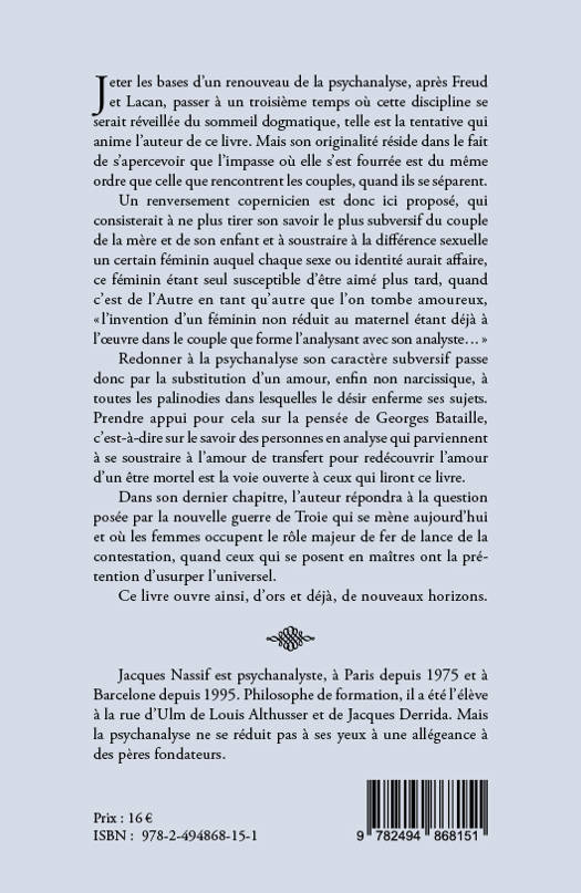 Jeter les bases d’un renouveau de la psychanalyse, après Freudet Lacan, passer à un troisième temps où cette discipline se serait réveillée dusommeil dogmatique, telle est la tentative qui anime l’auteur de ce livre. Maisson originalité réside dans le fait de s’apercevoir que l’impasse où elle s’estfourrée est du même ordre que celle que rencontrent les couples, quand ils seséparent. Un renversement copernicien est donc ici proposé, quiconsisterait à ne plus tirer son savoir le plus subversif du couple de la mèreet de son enfant et à soustraire à la différence sexuelle un certain fémininauquel chaque sexe ou identité aurait affaire, ce féminin étant seul susceptibled’être aimé plus tard, quand c’est de l’Autre en tant qu’autre que l’on tombeamoureux, «âl’invention d’un féminin non réduit au maternel étant déjà àl’oeuvre dans le couple que forme l’analysant avec son analyste...â» Redonner à la psychanalyse son caractère subversif passe donc par lasubstitution d’un amour, enfin non narcissique, à toutes les palinodies danslesquelles le désir enferme ses sujets. Prendre appui pour cela sur la pensée deGeorges Bataille, c’est-à-dire sur le savoir des personnes en analyse quiparviennent à se soustraire à l’amour de transfert pour redécouvrir l’amour d’unêtre mortel est la voie ouverte à ceux qui liront ce livre. Dans sondernier chapitre, l’auteur répondra à la question posée par la nouvelle guerrede Troie qui se mène aujourd’hui et où les femmes occupent le rôle majeur de ferde lance de la contestation, quand ceux qui se posent en maîtres ont laprétention d’usurper l’universel. Ce livre ouvre ainsi, d’ors etdéjà, de nouveaux horizons.