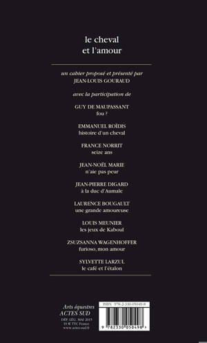 Comme l'a fait observer Aristote dans son «Histoire des animaux», « le plus disposé des mâles et des femelles à l'amour, après l'homme, c'est le cheval ! ». Dans ce second carnet de la collection « Arts équestres », Jean-Louis Gouraud rassemble une dizaine de contributions d'auteurs de toutes origines, écrivains, essayistes, historiens, voyageurs ou simples cavaliers, afin d'évoquer l'amour des hommes pour le cheval, l'amour des chevaux pour l'homme, mais aussi l'amour des hommes et des chevaux entre eux.