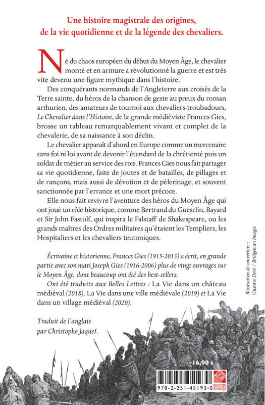 Une histoire magistrale des origines, de la vie quotidienne et de la legende des chevaliers. Ne du chaos europeen du debut du Moyen Age, le chevalier monte et en armure a revolutionne la guerre et est tres vite devenu une figure mythique dans l'histoire. Des conquerants normands de l'Angleterre aux croises de la Terre sainte, du heros de la chanson de geste au preux du roman arthurien, des amateurs de tournoi aux chevaliers-troubadours, Le Chevalier dans l'Histoire, de la grande medieviste Frances Gies, brosse un tableau remarquablement vivant et complet de la chevalerie, de sa naissance a son declin. Le chevalier apparait d'abord en Europe comme un mercenaire sans foi ni loi avant de devenir l'etendard de la chretiente puis un soldat de metier au service des rois. Frances Gies nous fait partager sa vie quotidienne, faite de joutes et de batailles, de pillages et de rancons, mais aussi de devotion et de pelerinage, et souvent sanctionnee par l'errance et une mort precoce. Elle nous fait revivre l'aventure des heros du Moyen Age qui ont joue un role historique, comme Bertrand du Guesclin, Bayard et Sir John Fastolf, qui inspira le Falstaff de Shakespeare, ou les grands maitres des Ordres militaires qu'etaient les Templiers, les Hospitaliers et les chevaliers teutoniques.