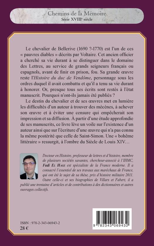 Le chevalier de Bellerive a cherché à se distinguer dans les Lettres durant toute sa vie avant de finir en prison, fou. Presque tous ses écrits sont restés à l’état de manuscrit. Le destin du chevalier met en lumière les difficultés d’un auteur à trouver des mécènes et à éviter la censure. A partir d’une étude de ses manuscrits, ce livre lève un voile sur l’existence d’un auteur et d’une œuvre qui n’a pas connu la postérité. Une « bohême littéraire » ressurgit à l’ombre du siècle de Louis XIV.