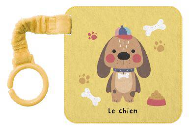 Un livre-tissu à accrocher à la poussette grâce à une sangle pour que bébé découvre les animaux en balade.