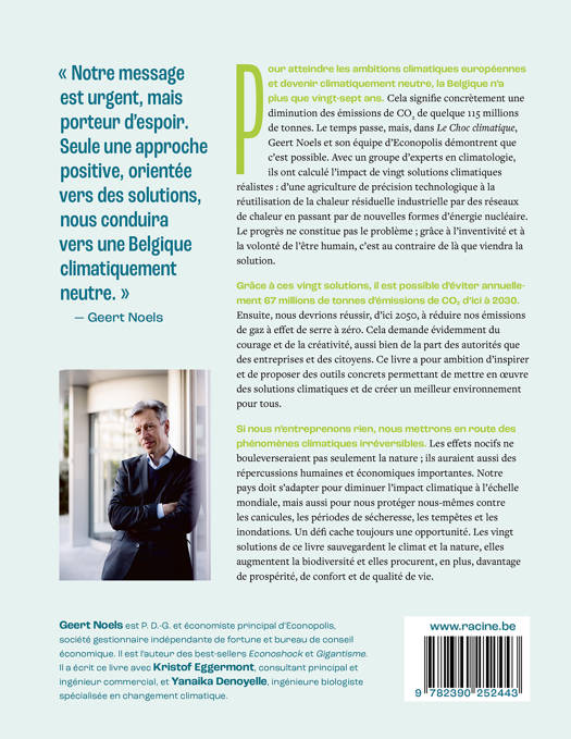Afin de répondre aux ambitions européennes en matière de climat, la Belgique ne dispose plus que de 28 ans pour devenir tout à fait climatiquement neutre. Cela signifie concrètement qu'elle doit diminuer son émission de CO2 de quelque 115 millions de tonnes. L'heure tourne, mais dans Le choc climatique, Geert Noels et son équipe d'Econopolis démontrent que c'est possible. Inspirés par le best-seller Drawdown de Paul Hawken et ensemble avec un panel d'experts en climatologie, ils ont calculé les effets de vingt solutions réalistes pour les pouvoirs publics, l'industrie et les citoyens, allant d'une agriculture technologique de précision jusqu'à la réutilisation de la chaleur résiduelle par le biais de réseaux de chauffage, en passant par de nouvelles formes d'énergie nucléaire. Le problème n'est pas tellement le progrès, c'est précisément par lui que viendra la solution. L'inventivité et la volonté des êtres humains peuvent venir à bout de multiples difficultés. Le choc climatique est un livre enthousiasmant et essentiel, destiné à tous ceux qui, n'étant pas familiarisés avec la technicité des questions climatiques, se sentent néanmoins désireux d'apprendre et de s'engager. à l'aide d'un langage clair, de graphiques lisibles et de propositions concrètes, les auteurs insistent sur l'urgence de la problématique tout en maintenant l'espoir par rapport à l'avenir. Les vingt solutions dans ce livre veulent sauvegarder le climat et la nature, augmenter la biodiversité et engendrer en outre davantage de prospérité, de confort et de qualité de vie. « Notre message est urgent mais plein d'espoir. Seule une approche positive et orientée vers les solutions nous conduira à une Belgique climatiquement neutre. » - Geert Noels « Les solutions pour le choc climatique améliorent aussi la qualité de vie et assurent la croissance économique sans dommages pour l'être humain et la nature. » - Kristof Eggermont