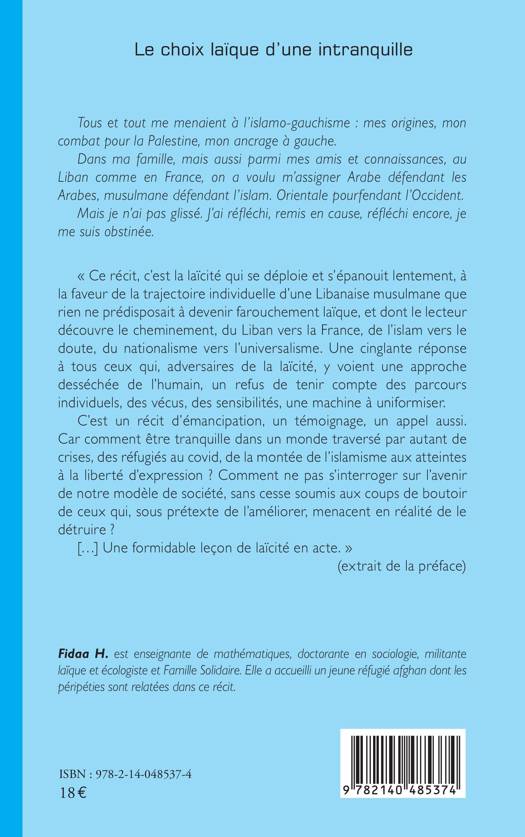 Tous et tout me menaient à l'islamo-gauchisme: mes origines, mon combat pour la Palestine, mon ancrage à gauche. Dans ma famille, mais aussi parmi mes amis et connaissances, au Liban comme en France, on a voulu m'assigner Arabe défendant les Arabes, musulmane défendant l'islam. Orientale pourfendant l'Occident. Mais je n'ai pas glissé. J'ai réfléchi, remis en cause, réfléchi encore, je me suis obstinée. Ce récit, c'est la laïcité qui se déploie et s'épanouit lentement, à la faveur de la trajectoire individuelle d'une Libanaise musulmane que rien ne prédisposait à devenir farouchement laïque, et dont le lecteur découvre le cheminement, du Liban vers la France, de l'islam vers le doute, du nationalisme vers l'universalisme. Une cinglante réponse à tous ceux qui, adversaires de la laïcité, y voient une approche desséchée de l'humain, un refus de tenir compte des parcours individuels, des vécus, des sensibilités, une machine à uniformiser. C'est un récit d'émancipation, un témoignage, un appel aussi. Car comment être tranquille dans un monde traversé par autant de crises, des réfugiés au covid, de la montée de l'islamisme aux atteintes à la liberté d'expression ? Comment ne pas s'interroger sur l'avenir de notre modèle de société, sans cesse soumis aux coups de boutoir de ceux qui, sous prétexte de l'améliorer, menacent en réalité de le détruire ? [...] Une formidable leçon de laïcité en acte. (extrait de la préface)