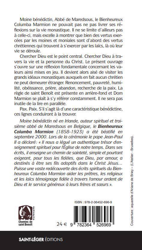 Moine bénédictin, Abbé de Maredsous, le Bienheureux Columba Marmion ne pouvait pas ne pas livrer ses réflexions sur la vie monastique. Il ne se limite d’ailleurs pas à celleci, mais excelle à montrer que bien des vertus exercées par les moines et moniales sont d’abord des vertus chrétiennes qui trouvent à s’exercer par les laïcs, là où leur vie se déroule. Chercher Dieu est le point central. Chercher Dieu à travers la vie et la personne du Christ. Le présent ouvrage s’ouvre sur une réflexion fondamentale concernant les valeurs ainsi mises en jeu. Il devient alors aisé de visiter les grands idéaux monastiques auxquels en fait aucun chrétien ne peut demeurer étranger. Renoncement, pauvreté, humilité, obéissance, prière, abandon, recherche de la paix. La règle de saint Benoît est présente en arrièrefond et Dom Marmion se plaît à s’y référer constamment. Il ne sera pas inutile de la lire en parallèle. Pax. Paix.