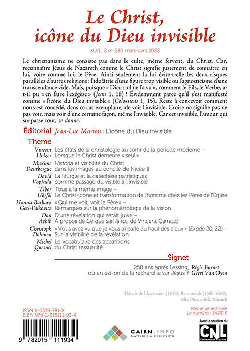 Comment articuler divinité et humanité dans la personne du Christ ? La réponse traditionnelle de la christologie est connue, présente déjà au concile de Chalcédoine. On peut aussi reprendre la question à partir du principe : « Qui m'a vu a vu le Père » (Jean 14, 9). Donc concevoir que celui qui a vu le Christ visible (pour reprendre une formule de saint Augustin) a vu le Père invisible (et qui le reste). Comment cela se peut-il, sinon que dans certains cas le visible se trouve envahi et saturé d'invisible - et par excellence dans le visage de Jésus, quand, agissant en Fils, il laisse apparaître sur son unique visibilité, l'invisibilité du Père. »