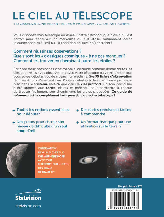 Écrit par deux passionnés d’astronomie, ce guide pratique donne toutes les clés pour réussir vos observations avec votre télescope ou votre lunette, que vous soyez débutant ou de niveau intermédiaire. Ses 75 fiches d’observation réunissent plus d’une centaine d’objets célestes à découvrir pas à pas, aussi bien dans le Système solaire que dans le ciel profond. Un soin particulier a été apporté aux cartes, claires et précises, pour permettre à chacun de trouver facilement son chemin vers les cibles proposées. Ce guide de référence est le complément indispensable de votre télescope !