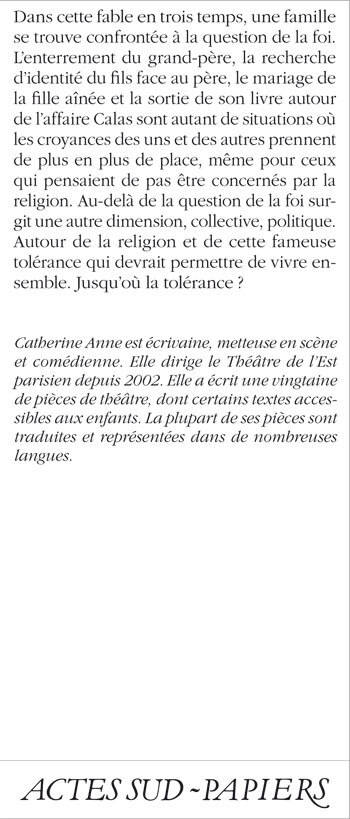 Dans cette fable en trois temps, une famille se trouve confrontée à la question de la foi. L'enterrement du grand-père, la recherche d'identité du fi ls face au père, le mariage de la fi lle aînée et la sortie de son livre autour de l'affaire Calas sont autant de situations où les croyances des uns et des autres prennent de plus en plus de place, même pour ceux qui pensaient de pas être concernés par la religion. Au-delà de la question de la foi surgit une autre dimension, collective, politique. Autour de la religion et de cette fameuse tolérance qui devrait permettre de vivre ensemble. Jusqu'où la tolérance ?