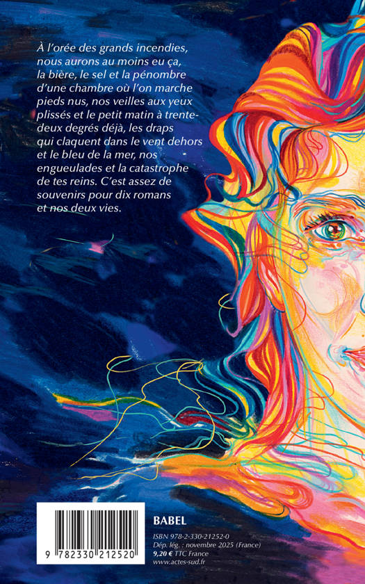 À l'orée des grands incendies, nous aurons au moins eu ça, la bière, le sel et la pénombre d'une chambre où l'on marche pieds nus, nos veilles aux yeux plissés et le petit matin à trente-deux degrés déjà, les draps qui claquent dans le vent dehors et le bleu de la mer, nos engueulades et la catastrophe de tes reins. C'est assez de souvenirs pour dix romans et nos deux vies.