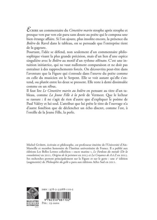 Ecrire un commentaire du Cimetiere marin strophe apres strophe et presque vers par vers eut paru sans doute au poete qui le composa une bien etrange affaire. Si l'on ajoute, plus insolite encore, la presence du Bolero de Ravel dans le tableau, on se persuade que l'entreprise tient de la gageure. Pourtant, l'idee se defend, non seulement d'un commentaire philosophique visant la plus grande precision, mais d'un lien d'une espece singuliere avec le Bolero au motif d'un rythme ostinato. C'est une intuition initiatrice, qui ne vaut nullement comparaison et ne doit pas entrainer a des rapprochements forces. On decouvrira peut-etre dans l'aventure que la Figure qui s'enroule dans l'oeuvre du poete comme en celle du musicien est le Serpent. Elle se voit autant qu'elle s'entend, ou plutot entre les deux se pressent. Elle reste a demi dissimulee comme en un rebus. Il faut lire Le Cimetiere marin au bolero en pensant au titre d'un tableau, comme La Jeune Fille a la perle de Vermeer. Que le lecteur se rassure: il ne s'agit de rien d'autre que d'expliquer le poeme de Paul Valery et lui seul. L'attribut que lui prete le titre de l'ouvrage n'a d'autre fonction que de declencher un echo discret, comme l'est, a l'oreille de la Jeune Fille, la perle.