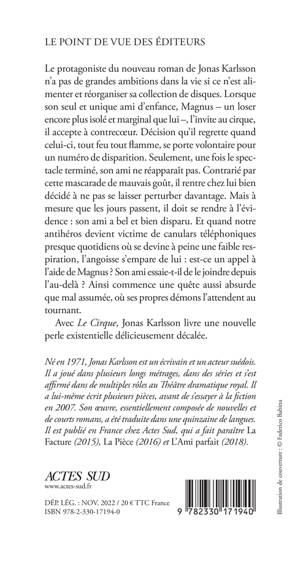 Le protagoniste du nouveau roman de Jonas Karlsson n'a pas de grandes ambitions dans la vie si ce n'est alimenter et réorganiser sa collection de disques. Lorsque son seul et unique ami d'enfance, Magnus - un loser encore plus isolé et marginal que lui -, l'invite au cirque, il accepte à contrecoeur. Décision qu'il regrette quand celui-ci, tout feu tout flamme, se porte volontaire pour un numéro de disparition. Seulement, une fois le spectacle terminé, son ami ne réapparaît pas. Contrarié par cette mascarade de mauvais goût, il rentre chez lui bien décidé à ne pas se laisser perturber davantage. Mais à mesure que les jours passent, il doit se rendre à l'évidence : son ami a bel et bien disparu. Et quand notre antihéros devient victime de canulars téléphoniques presque quotidiens où se devine à peine une faible respiration, l'angoisse s'empare de lui : est-ce un appel à l'aide de Magnus ? Son ami essaie-t-il de le joindre depuis l'au-delà ? Ainsi commence une quête aussi absurde que mal assumée, où ses propres démons l'attendent au tournant. Avec "Le Cirque", Jonas Karlsson livre une nouvelle perle existentielle délicieusement décalée.