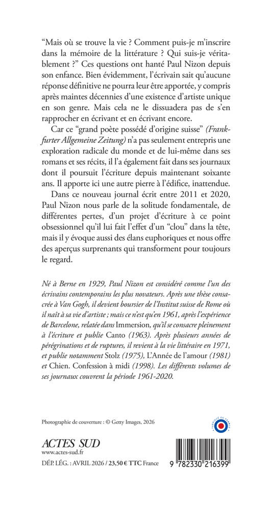 "Mais où se trouve la vie ? Comment puis-je m'inscrire dans la mémoire de la littérature ? Qui suis-je véritablement ?" Ces questions ont hanté Paul Nizon depuis son enfance. Bien évidemment, l'écrivain sait qu'aucune réponse définitive ne pourra leur être apportée, y compris après maintes décennies d'une existence d'artiste unique en son genre. Mais cela ne le dissuadera pas de s'en rapprocher en écrivant et en écrivant encore. Car ce "grand poète possédé d'origine suisse" (Frankfurter Allgemeine Zeitung) n'a pas seulement entrepris une exploration radicale du monde et de lui-même dans ses romans et ses récits, il l'a également fait dans ses journaux dont il poursuit l'écriture depuis maintenant soixante ans. Il apporte ici une autre pierre à l'édifice, inattendue. Dans ce nouveau journal écrit entre 2011 et 2020, Paul Nizon nous parle de la solitude fondamentale, de différentes pertes, d'un projet d'écriture à ce point obsessionnel qu'il lui fait l'effet d'un "clou" dans la tête, mais il y évoque aussi des élans euphoriques et nous offre des aperçus surprenants qui transforment pour toujours le regard.