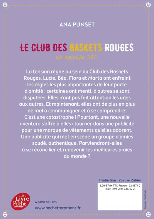 La tension règne au sein du Club des Baskets Rouges. Lucie, Béa, Flora et Marta ont enfreint les règles les plus importantes de leur pacte d’amitié : certaines ont menti ; d’autres se sont disputées ; elles n’ont pas fait attention les unes aux autres. Être maintenant, elles ont de plus en plus de mal à communiquer et se comprendre. C’est une catastrophe ! Pourtant, une nouvelle aventure s’offre à elle : tourner dans une publicité pour une marque de vêtements qu’elles adorent. Une publicité qui met en scène un groupe d’amies soudé, authentique. Parviendront-elles à se réconcilier et à redevenir les meilleures amies du monde ?