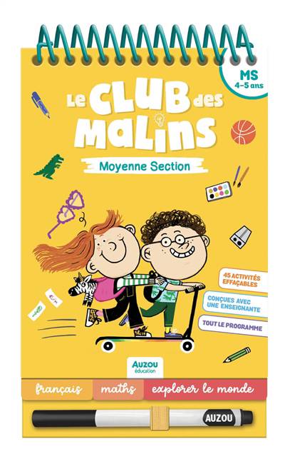 45 jeux effaçables, dans un format bloc-notes et répartis par matières, pour s'amuser et découvrir le programme de lecture, d'écriture, de maths et d'exploration du monde de moyenne section.