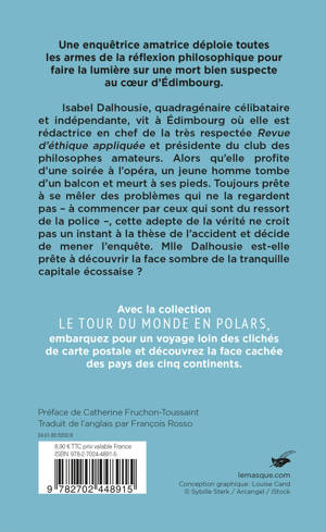 Isabel Dalhousie, quadragénaire célibataire et indépendante, vit à Édimbourg où elle est rédactrice en chef de la très respectée Revue d'éthique appliquée et présidente du club des philosophes amateurs. Alors qu’elle profite d’une soirée à l’opéra, un jeune homme tombe d'un balcon et meurt à ses pieds. Toujours prête à se mêler des problèmes qui ne la regardent pas – à commencer par ceux qui sont du ressort de la police –, cette adepte de la vérité ne croit pas un instant à la thèse de l'accident et décide de mener l’enquête. Mademoiselle Dalhousie est-elle prête à découvrir la face sombre de la tranquille capitale écossaise ? Traduction révisée de François Rosso