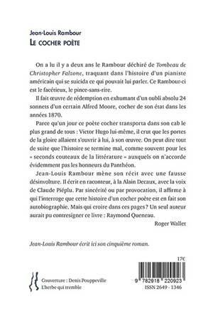 Ce roman dédié aux « seconds couteaux de la littérature » évoque la figure d’Alfred Moore, cocher de son état mais aussi auteur de quelques vers. Ayant eu l’honneur d’embarquer dans son cab le grand Victor Hugo, il rêva d’être soutenu par le maître dans l’espoir de voir édités ses poèmes. Ce « cocher poète », comme le surnommèrent les journaux de l’époque, a bel et bien existé. Jean-Louis Rambour en a imaginé la vie.