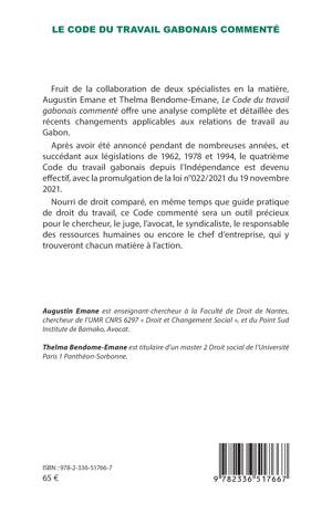 Fruit de la collaboration de deux spécialistes en la matière, Augustin Emane et Thelma Bendome-Emane, Le Code du travail gabonais commenté offre une analyse complète et détaillée des récents changements applicables aux relations de travail au Gabon. Après avoir été annoncé pendant de nombreuses années, et succédant aux législations de 1962, 1978 et 1994, le quatrième Code du travail gabonais depuis l'Indépendance est devenu effectif, avec la promulgation de la loi n°022/2021 du 19 novembre 2021. Nourri de droit comparé, en même temps que guide pratique de droit du travail, ce Code commenté sera un outil précieux pour le chercheur, le juge, l'avocat, le syndicaliste, le responsable des ressources humaines ou encore le chef d'entreprise, qui y trouveront chacun matière à l'action.
