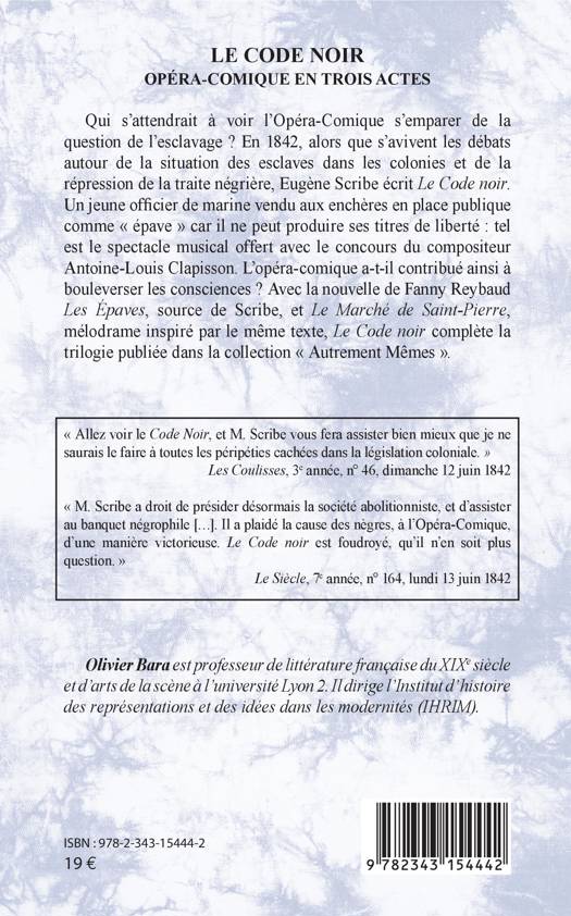 Qui s'attendrait à voir l'Opéra-Comique s'emparer de la question de l'esclavage ? En 1842, alors que s'avivent les débats autour de la situation des esclaves dans les colonies et de la répression de la traite négrière, Eugène Scribe écrit un opéra-comique dans lequel « un jeune homme élevé en France, loin de ses parents, qu'il ne connaît pas, a lieu de croire qu'il est d'une famille noble. Il revient dans la colonie et par bonheur retrouve sa mère. Mais il est reconnu par un esclave et vendu au profit du gouvernement suivant le code noir. » (Edith E. Lucas) L'opéra-comique aurait-t-il contribué à bouleverser les consciences ?