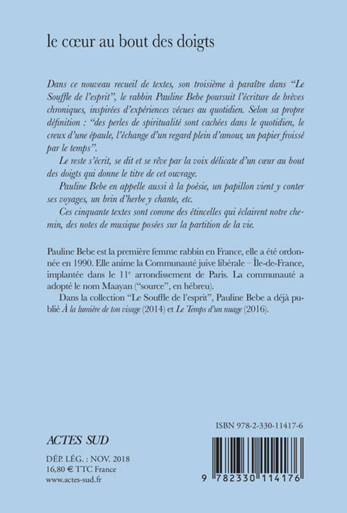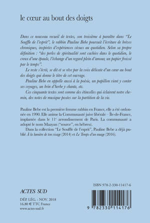 Dans ce nouveau recueil de textes, le troisième à paraître dans "Le Souffle de l'esprit", le Rabbin Pauline Bebe, première femme rabbin de France, poursuit l'écriture de brèves chroniques qu'elle appelle des "vignettes", inspirées d'expériences vécues au quotidien. Selon sa propre définition : "des perles de spiritualité sont cachées dans le quotidien, le creux d'une épaule, l'échange d'un regard plein d'amour, un papier froissé par le temps". Le reste s'écrit, se dit et se rêve par l'inspiration délicate d'un coeur au bout des doigts qui donne le titre de cet ouvrage. Pauline Bebe en appelle aussi à la poésie, un papillon vient y conter ses voyages, un brin d'herbe y chante, etc. Ces cinquante textes sont comme des étincelles qui éclairent notre chemin, des notes de musique posées sur la p