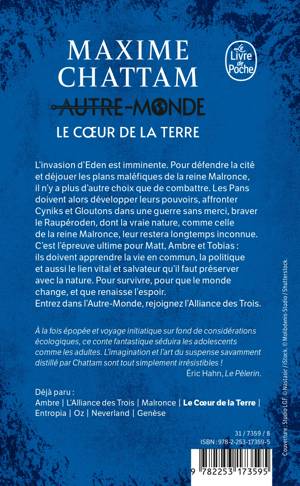 L'invasion d'Eden est imminente. Pour défendre la cité et déjouer les plans maléfiques de la reine Malronce, il n'y a plus d'autre choix: il faut combattre. Les Pans doivent alors développer leurs pouvoirs, affronter Cyniks et Gloutons dans une guerre sans merci, braver le Raupéroden, dont la vraie nature, comme celle de la reine Malronce, leur restera longtemps inconnue. C'est l'épreuve ultime pour Matt, Ambre et Tobias, qui doivent apprendre la vie en commun, la politique, et aussi le lien vital et salvateur qu'il faut préserver avec la nature. Pour survivre, pour que le monde change, et que renaisse l'espoir. Entrez dans l'Autre-Monde, rejoignez l'Alliance des Trois. Elle vous mènera, avec elle, jusqu'au bout de sa longue quète...