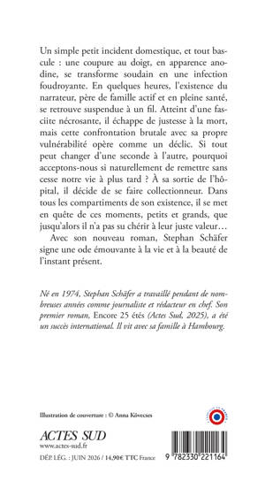 Un simple petit incident domestique, et tout bascule : une coupure au doigt, en apparence anodine, se transforme soudain en une infection foudroyante. En quelques heures, l'existence du narrateur, père de famille actif et en pleine santé, se retrouve suspendue à un fil. Atteint d'une fasciite nécrosante, il échappe de justesse à la mort, mais cette confrontation brutale avec sa propre vulnérabilité opère comme un déclic. Si tout peut changer d'une seconde à l'autre, pourquoi acceptons-nous si naturellement de remettre sans cesse notre vie à plus tard ? À sa sortie de l'hôpital, il décide de se faire collectionneur. Dans tous les compartiments de son existence, il se met en quête de ces moments, petits et grands, que jusqu'alors il n'a pas su chérir à leur juste valeur... Avec son nouveau roman, Stephan Schäfer signe une ode émouvante à la vie et à la beauté de l'instant présent.