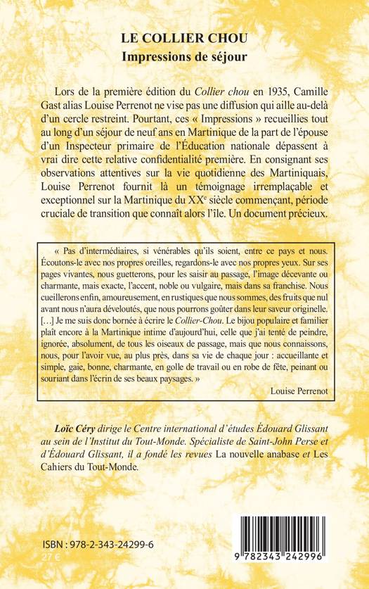 Lors de la première édition du Collier chou en 1935, Camille Gast alias Louise Perrenot ne vise pas une diffusion qui aille au-delà d'un cercle restreint. Pourtant, ces Impressions recueillies tout au long d'un séjour de neuf ans en Martinique de la part de l'épouse d'un Inspecteur primaire de l'Éducation nationale dépassent à vrai dire cette relative confidentialité première. En consignant ses observations attentives sur la vie quotidienne des Martiniquais, Louise Perrenot fournit là un témoignage irremplaçable et exceptionnel sur la Martinique du XXe siècle commençant, période cruciale de transition que connaît alors l'île. Un document précieux.
