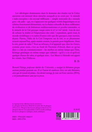 Les ideologies dominantes dans le domaine des etudes sur la Grece ancienne ont instaure deux miracles auxquels je ne crois pas: le miracle "indo-europeen" du second millenaire - simple remontee du "miracle grec" de jadis - qui, en s'appuyant sur quelques verites linguistiques et un schema fonctionnel elementaire, nie la chaine culturelle de deux millenaires de civilisation et de litterature mediterraneennes et proche-orientales, et le miracle de la Cite grecque surgie entre le xie et viiie siecle: loin de moi de refuser la realite et l'importance des cites ! cependant, apres tout, le monde neolithique a vu naitre d'autres cites que des grecques, mais surtout, depuis Platon, l'Idee de la Cite l'emporte sur la cite, et ce phantasme nourrit aujourd'hui, apres maints avatars, la pensee post-hegelienne. Hors la cite, point de salut ? Tout au rebours, il m'apparait que chez les Grecs, comme pour nous, c'est au fond de l'homme d'abord, dans ce qu'un dieu y a mis au commencement - les mythes en meme temps que l'etre, heritage genetique en meme temps que culturel - qu'il y a eu et qu'il est quelque chance de salut, et quelque sens... Les Muses a Hesiode ont appris les verites. Sur l'Helicon.