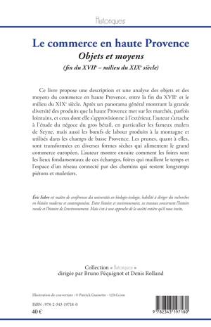 Ce livre propose une description et une analyse des objets et des moyens du commerce en haute Provence, entre la fin du XVIIe et le milieu du XIXe siècle. Après un panorama général montrant la grande diversité des produits que la haute Provence met sur les marchés, parfois lointains, et ceux dont elle s'approvisionne à l'extérieur, l'auteur s'attache à l'étude du négoce du gros bétail, en particulier les fameux mulets de Seyne, mais aussi les boeufs de labour produits à la montagne et utilisés dans les champs de basse Provence. L'auteur montre ensuite comment les foires sont les lieux fondamentaux de ces échanges, qui maillent le temps et l'espace d'un réseau connecté par des chemins qui restent longtemps piétons et muletiers.