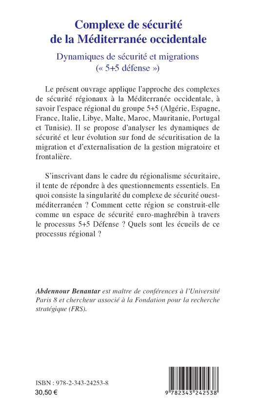Cet ouvrage applique l’approche des complexes de sécurité régionaux à la Méditerranée occidentale, à savoir l’espace régional du groupe 5+5 (Algérie, Espagne, France, Italie, Libye, Malte, Maroc, Mauritanie, Portugal et Tunisie). Il se propose d’analyser les dynamiques de sécurité et leur évolution sur fond de sécuritisation de la migration et d’externalisation de la gestion migratoire et frontalière. S’inscrivant dans le cadre du régionalisme sécuritaire, il tente de répondre à des questionnements essentiels. En quoi consiste la singularité du complexe de sécurité ouest-méditerranéen ? Comment cette région se construit-elle comme un espace de sécurité euro-maghrébin à travers le processus 5+5 Défense ? Quels sont les écueils de ce processus régional ?