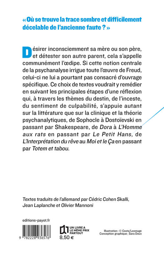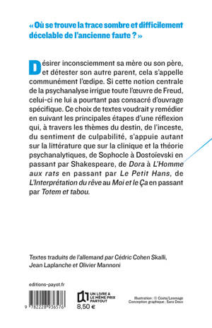 "Où se trouve la trace sombre et difficilement décelable de l'ancienne faute ?" Désirer inconsciemment sa mère ou son père, et détester son autre parent, cela s'appelle communément l'oedipe. Si cette notion centrale de la psychanalyse irrigue toute l'oeuvre de Freud, celui-ci ne lui a pourtant pas consacré d'ouvrage spécifique. Ce choix de textes voudrait y remédier en suivant les principales étapes d'une réflexion qui, à travers les thèmes du destin, de l'inceste, du sentiment de culpabilité, s'appuie autant sur la littérature que sur la clinique et la théorie psychanalytiques, de Sophocle à Dostoïevski en passant par Shakespeare, de Dora> à L'Homme aux Rats> en passant par Le Petit Hans>, de L'Interprétation du rêve> au Moi et le Ça> en passant par Totem et tabou>.