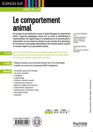 Cet ouvrage est une introduction concise à l’étude biologique du comportement animal. L’approche pédagogique choisie met en valeur la méthodologie et l’expérimentation. De l’apprentissage à la reproduction, de la communication à l’alimentation, le cours intègre les données les plus récentes de la physiologie, de l’évolution et la psychologie expérimentale. Cette troisième édition comporte un nouveau chapitre sur la personnalité animale. Les plus : Un cours illustré et didactique avec de nombreux exemples sous forme d’encarts. Un résumé des points clés et des questions de révision à la fin de chaque chapitre. Cours à jour des dernières avancées dans la discipline.