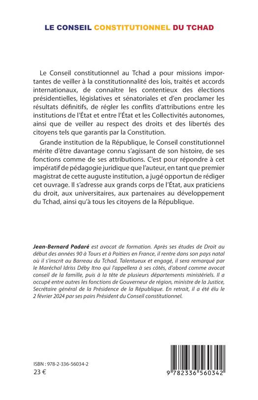 Le Conseil constitutionnel au Tchad a pour missions importantes de veiller à la constitutionnalité des lois, traités et accords internationaux, de connaître les contentieux des élections présidentielles, législatives et sénatoriales et d'en proclamer les résultats définitifs, de régler les conflits d'attributions entre les institutions de l'État et entre l'État et les Collectivités autonomes, ainsi que de veiller au respect des droits et des libertés des citoyens tels que garantis par la Constitution. Grande institution de la République, le Conseil constitutionnel mérite d'être davantage connu s'agissant de son histoire, de ses fonctions comme de ses attributions. C'est pour répondre à cet impératif de pédagogie juridique que l'auteur, en tant que premier magistrat de cette auguste institution, a jugé opportun de rédiger cet ouvrage. Il s'adresse aux grands corps de l'État, aux praticiens du droit, aux universitaires, aux partenaires au développement du Tchad, ainsi qu'à tous les citoyens de la République.