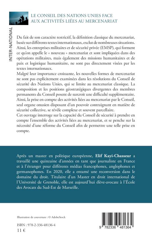 Du fait de son caractère restrictif, la définition classique du mercenariat, basée sur différents textes internationaux, exclut de nombreuses situations. Ainsi, les entreprises militaires et de sécurité privée (EMSP), qui forment ce qu'on appelle le nouveau mercenariat et sont impliquées dans des opérations militaires, mais également des missions humanitaires et de paix et logistique humanitaire, ne sont pas directement visées par les textes internationaux. Malgré leur importance croissante, les nouvelles formes de mercenariat ne sont pas explicitement examinées dans les résolutions du Conseil de sécurité des Nations Unies, qui se limite au mercenariat classique. La composition et les positions géostratégiques divergentes des membres permanents du Conseil posent de surcroit une difficulté supplémentaire. Ainsi, la prise en compte des activités liées au mercenariat par le Conseil, seul organe onusien disposant d'un pouvoir contraignant en matière de sécurité collective, se révèle complexe et souvent parcellaire. Cet ouvrage interroge sur la capacité du Conseil de sécurité à prendre en compte l'ensemble des activités liées au mercenariat, et se penche sur la nécessité d'une réforme du Conseil afin de permettre une telle prise en compte.