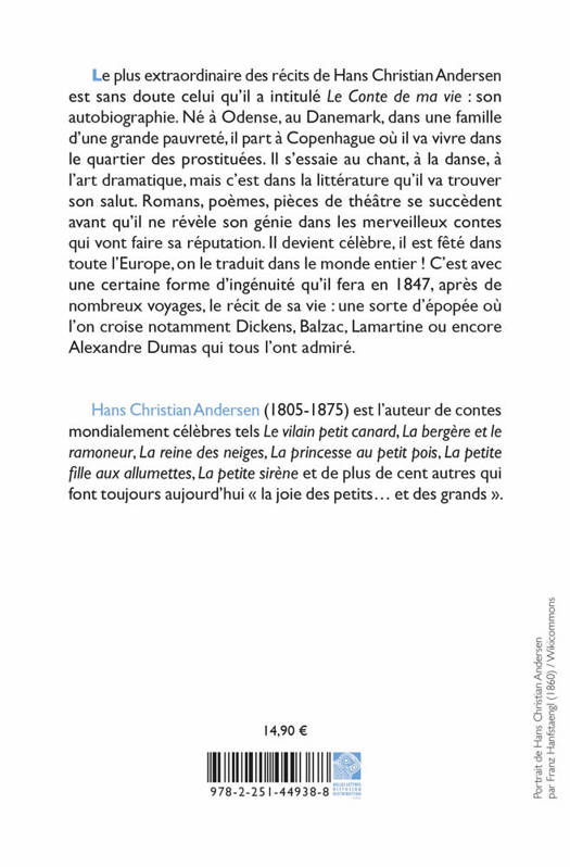 Le plus extraordinaire des recits de Hans Christian Andersen est sans doute celui qu'il a intitule Le Conte de ma vie: son autobiographie. Ne a Odense, au Danemark, dans une famille d'une grande pauvrete, il part a Copenhague ou il va vivre dans le quartier des prostituees. Il s'essaie au chant, a la danse, a l'art dramatique, mais c'est dans la litterature qu'il va trouver son salut. Romans, poemes, pieces de theatre se succedent avant qu'il ne revele son genie dans les merveilleux contes qui vont faire sa reputation. Il devient celebre, il est fete dans toute l'Europe, on le traduit dans le monde entier ! C'est avec une certaine forme d'ingenuite qu'il fera en 1847, apres de nombreux voyages, le recit de sa vie: une sorte d'epopee ou l'on croise notamment Dickens, Balzac, Lamartine ou encore Alexandre Dumas qui tous l'ont admire.